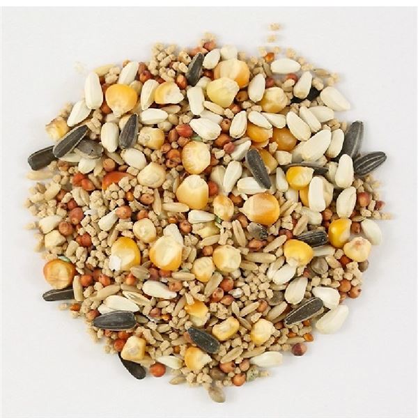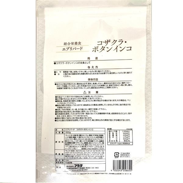 ペレット(米、米糠、粟、炭酸カルシウム、果糖、天日原塩、乳酸菌、トルラ酵母、糖蜜、ケイ酸アルミナ、アルファミール、麦芽発酵エキス、ビタミン類(A、D3、E、B1、B2、B6、B12、D-パントテン酸カルシウム、ニコチン酸)、ミネラル類(硫酸マンガン、硫酸亜鉛、硫酸銅、硫酸マグネシウム、硫酸鉄、塩化コバルト)、アミノ酸類(塩化コリン、メナジオンK3)、香料)、キビ、マイロ、カナリアシード、小粒ひまわり、メーズ、麻の実、サフラワー、ムキえん麦、ボレー、グリーンボレー