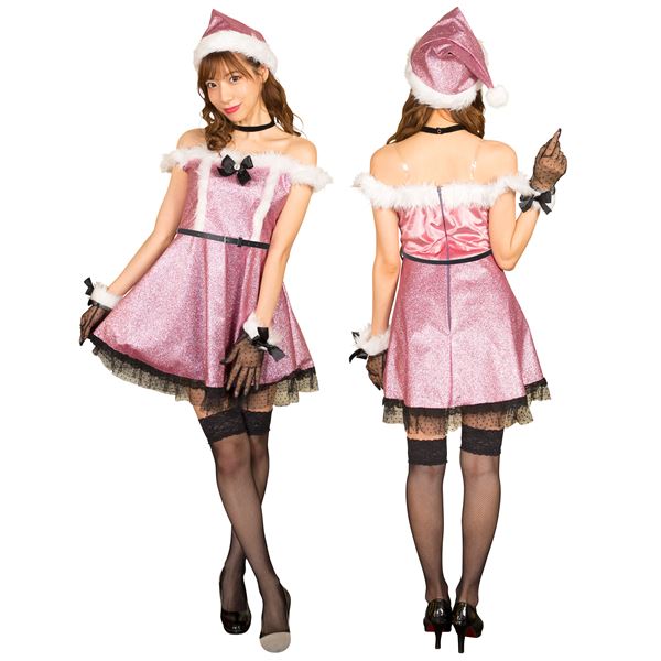 キラキラのピンクグリッター生地が特別感を演出。リボンブローチは、胸元や帽子など好きな場所に付けることが可能。ドットチュール素材のグローブがポイント。周りと差を付けたいクリスマスコスチュームは、ピンク×ブラックで!