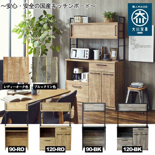 食器棚 幅約90cm 引き戸タイプ レディーオーク 日本製 アイアン 古木風 木目柄 カップボード キッチン 台所 インテリア家具【代引不可】