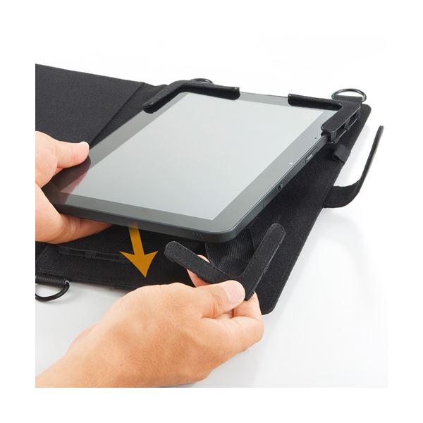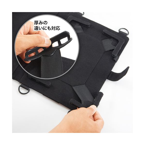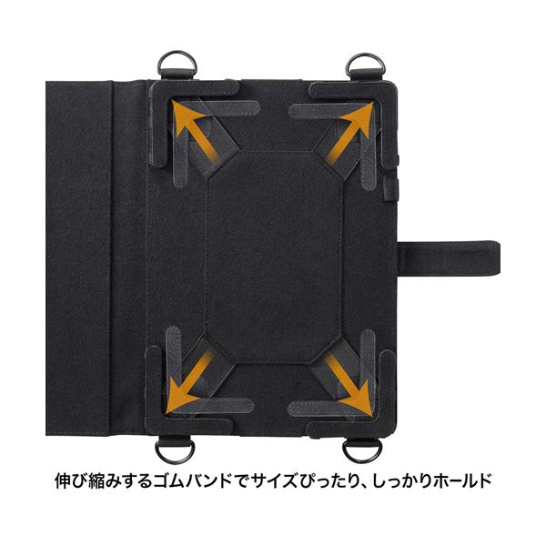 ●四隅の伸縮ゴムで固定し、13インチまでの様々なタブレットに対応します。
