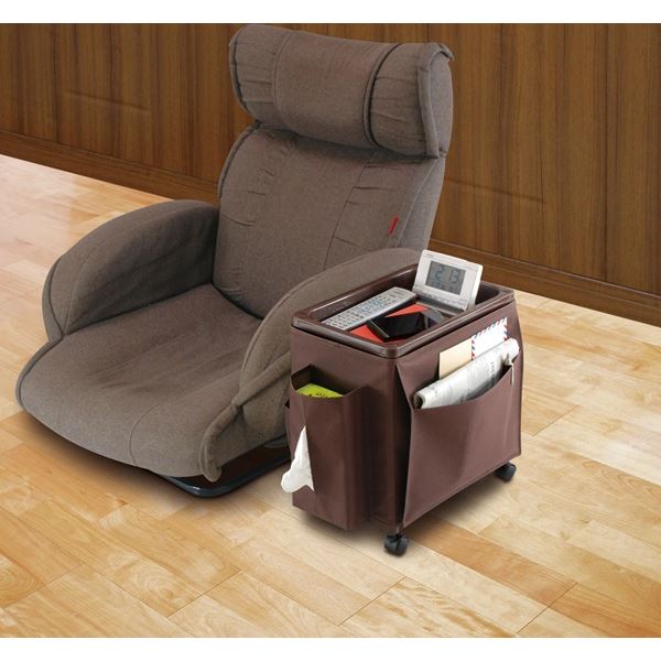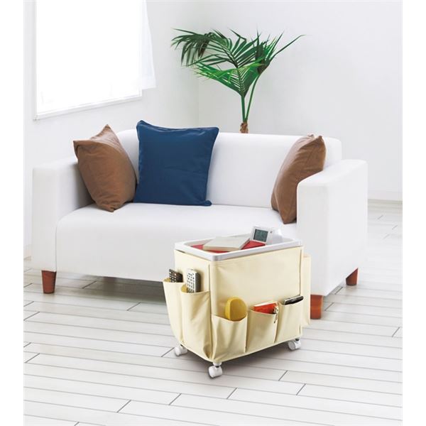 ティッシュや新聞、リモコンなどソファや座椅子のそばにあると便利なものをまとめて収納できるサイドテーブルワゴン。