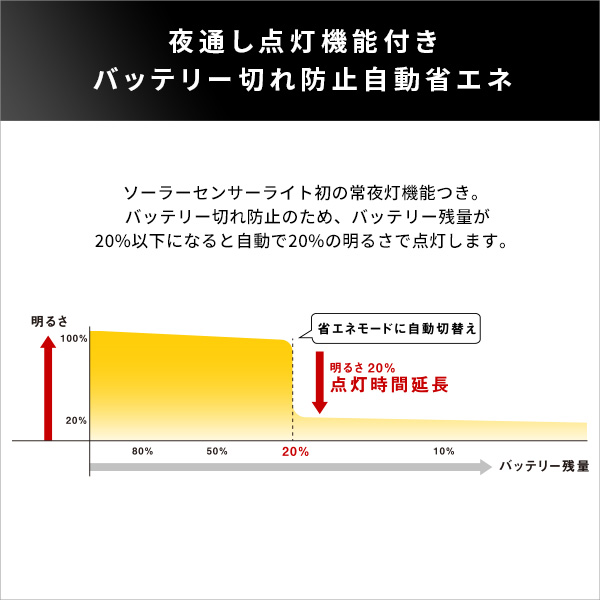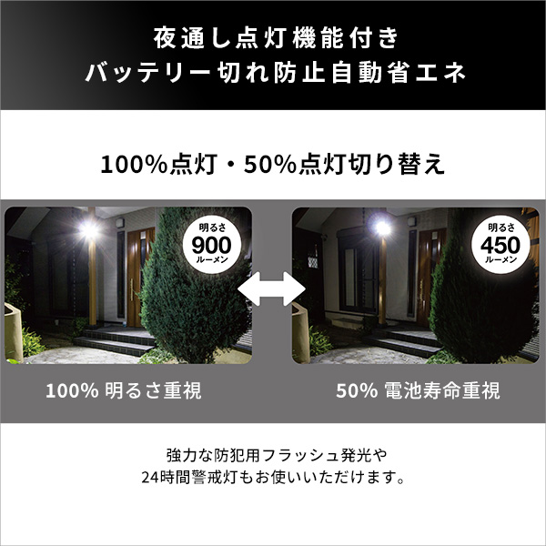 夜通し点灯機能でバッテリー切れ防止自動省エネモードに切り替わります!
