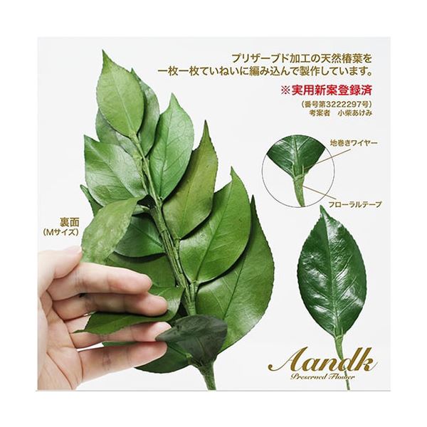 プリザーブド加工された丹波産の高級椿葉の中から、ツヤのある綺麗な葉のみを厳選使用。実用新案の技術を用いて、葉っぱ一枚一枚にワイヤーを通し、神棚に飾る榊として美しい形になるように成形。外国産にありがちな、枯れる、葉が丸まる、しおれるということがほとんどなく、適した環境に保管できれば3年以上美しい状態を保てます。水やりが不要なので、水が腐るニオイもなく清潔。特に高い場所にある神棚の場合、水換えは手間のかかる作業ですがそれも必要ありません。造花(シルクフラワー)とは異なり、本物の生木を保存加工したものだから、神様にためらうことなくお供えできます。