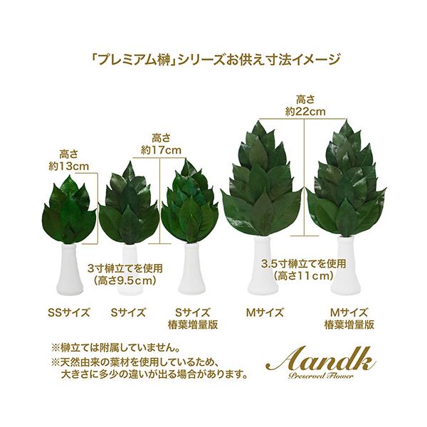 ご家庭の榊立てに合わせて、SSサイズ、Sサイズ、Mサイズ、さらに「ボリュームのあるものが欲しい」との声に応えて、よりボリューム感、立体感のある椿葉増量タイプ(S・Mサイズ)もご用意。