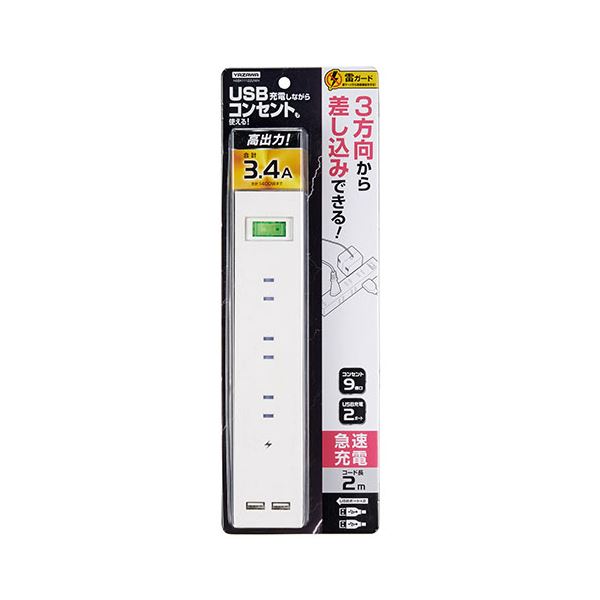 YAZAWA 3方向から挿せる9個口USBタップ ホワイト H6BK11122UWH