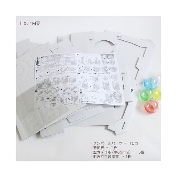 ●セット内容:ダンボールパーツ×12枚、透明板×1枚、空カプセル(65mm) ×5個、組立説明書×1枚