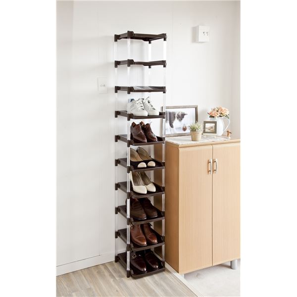 靴を最大10足収納できる、便利なシューズラック 10段。毎日散らかってしまう玄関まわりをスッキリ収納できます。また、会社のオフィス関連・工場などシューズラックとして様々なシーンでお使いいただけます。支柱部分は透明で丈夫なポリスチレン材を使用しているので、強度があり高級感を演出します。棚板がプラスチック製なので、お手入れもカンタンです。シューズラックの段数を分割して使用することもかのうです。(例として6段と4段など)また、お気に入りの靴を飾ってコレクションシューズラックとしてもお使いいただけます。