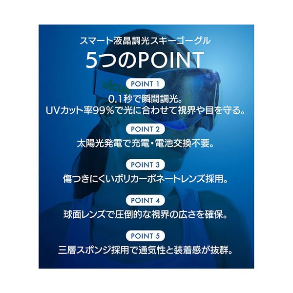 【スマート液晶調光スキーゴーグル】は一般のスキーゴーグルと同じようにご使用いただけます。太陽光で発電し、調光機能はインテリジェンス光センサーが自動的に行うため初期設定など必要ありません。