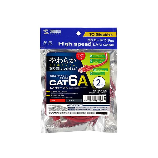 【5個セット】 サンワサプライ カテゴリ6Aより線LANケーブル 2m レッド KB-T6AY-02RX5