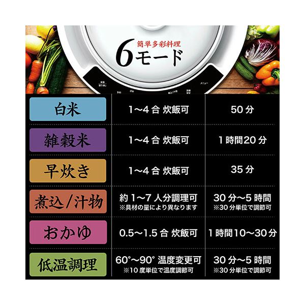 ●6つの調理モード 各操作は、タッチパネルで簡単に操作が可能です。「白米」「混合米」「早炊き」「煮込/汁物」「おかゆ」「低温調理」の6つのモードから選択して調理することができます。炊飯器1つで様々な調理ができるので、メニューの幅も広がり毎日の食事を手軽に、美味しく、楽しく、お召し上がりいただけます。予約時間は「30分〜24時間」保温時間「2時間」まで設定が可能。炊飯、予約、保温中の残り時間は中央の画面で確認できます。お好きな時間に設定して、いつでも炊き立てのご飯をお召し上がください。