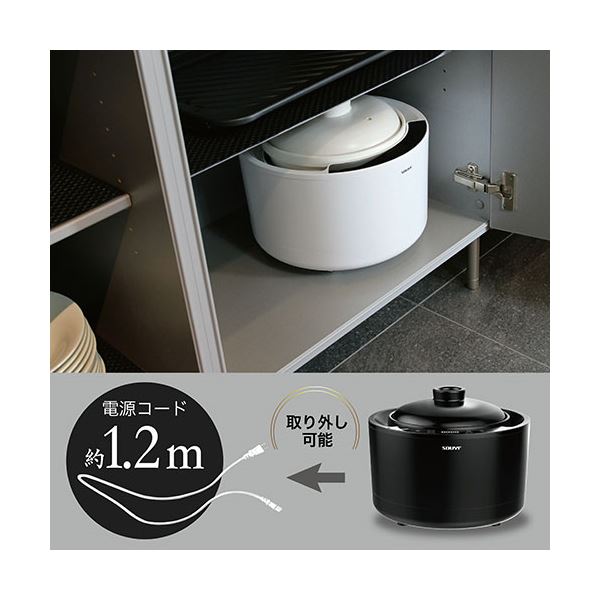 ●収納性も抜群 土鍋炊飯器は本体と内釜の2層構造となっている為、本体から内釜を取り出して、内釜のみを使用することもできます。また、土鍋炊飯器の電源コードは取り外しが可能です。使用しない時は、電源コードを取り外してそのままスリムに棚に収納できます。収納しやすいサイズなので置く場所にも困りません。