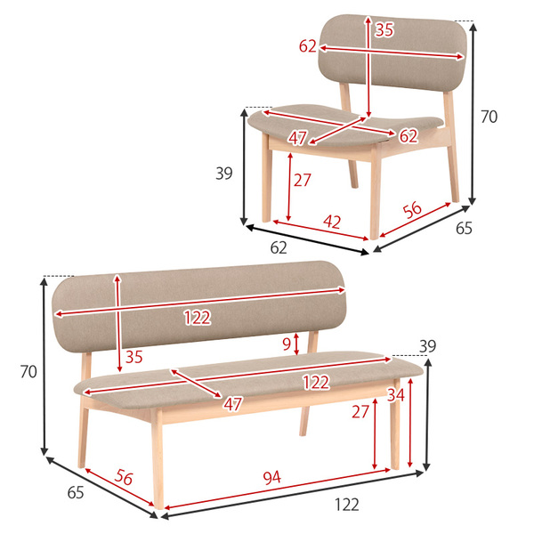 ベンチ:幅122×奥行65×高さ70×座面高39cm