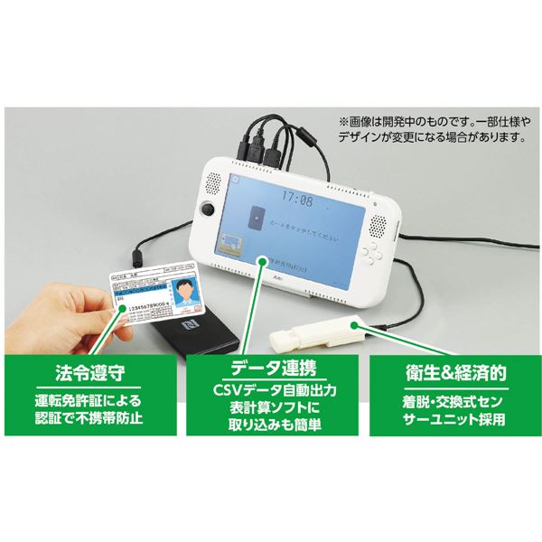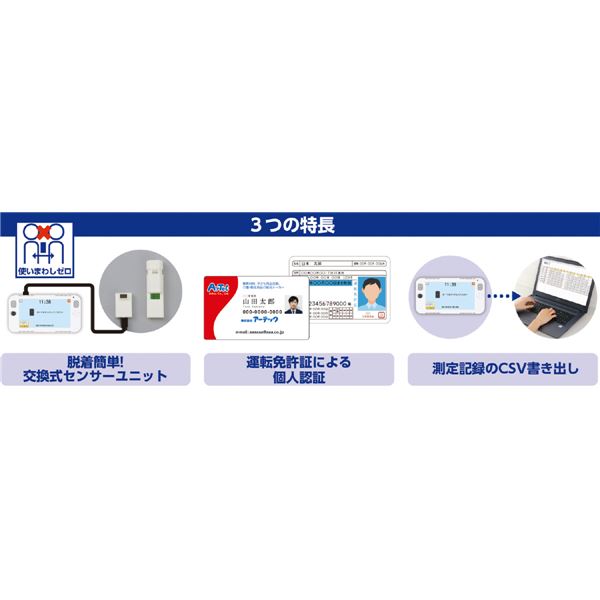 ●法令順守!運転免許証による認識で不携帯防止。出張・直行直帰対応の専用アプリで外出先からもログを残せる!※セットには1個のセンサーユニットが付属していますが、複数人で使用する場合アルコール検知センサーユニット(別売)が人数分必要です。カードリーダー仕様/ソニーPaSoRi、読み取り可能非接触ICカード規格/FeliCaカード、TypeAカード、TypeBカード。PaSoRiはソニー(株)の登録商標です。※FeliCaはソニー(株)の登録商標です。