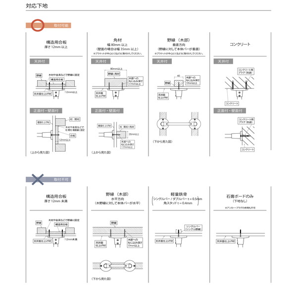 構造用合板(厚さ12mm未満)、野縁(木部:水平方向)、軽量鉄骨、石膏ボードのみなどには取付不可になります。