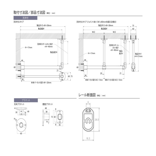 本体バー1本,天井ブラケット1個,壁面ブラケット1個,天井吊りポール1本,天井Lジョイント1個,六角レンチ1本,取付ネジ(ナベ3.5×35mm)