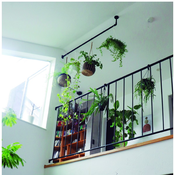 天井近くにハンギングバーを設置すれば、長さのあるグリーンやモビール、インテリア小物などをディスプレイすることができます。
