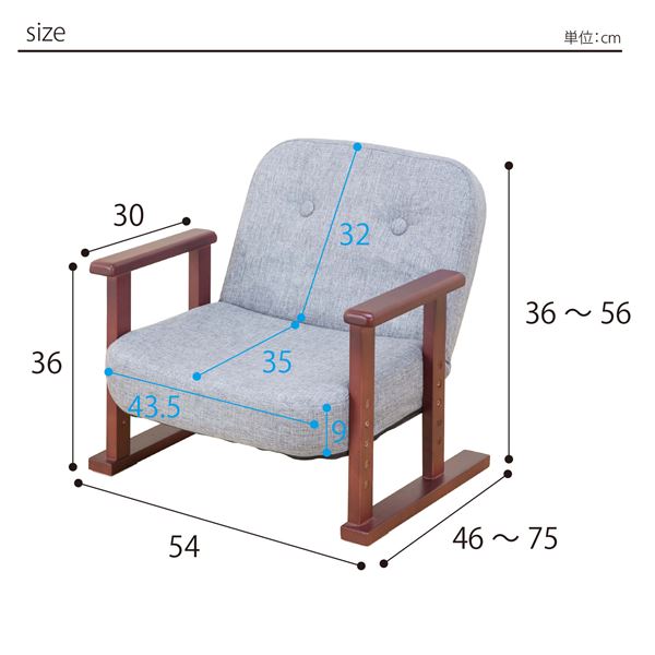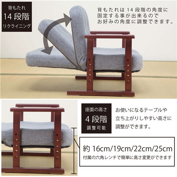 背もたれ14段階リクライニングでお好みの角度でリラックスできます。座面の高さは4段階に調節できます。(約16・19・22・25cm)木製の肘掛けで立ち上がりが楽にできます。座卓との相性もぴったりです。