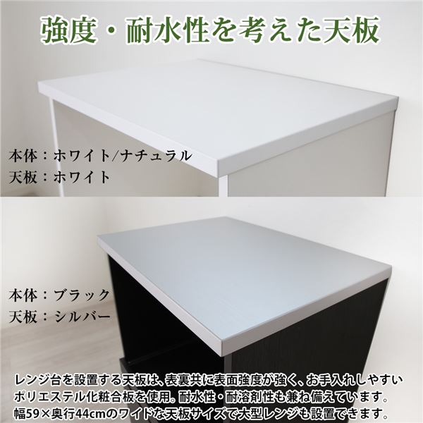 レンジを設置する天板は表裏共に強度が強く、お手入れしやすいポリエステル化粧合板。