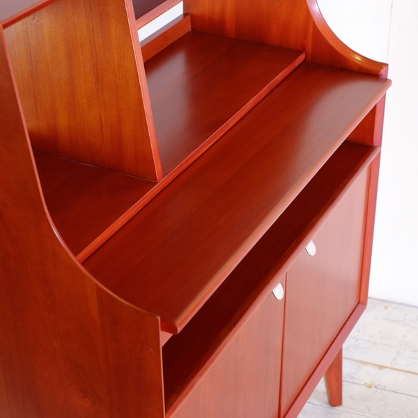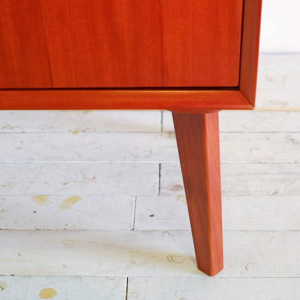 ・1950年代のデンマーク家具をイメージ。フチのVカット。ちょっと赤い、艶のある仕上げ。美しい木目。高級材マホガニーの突板を使用して北欧ヴィンテージ家具の雰囲気に仕上げました。