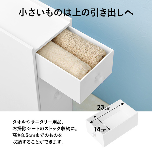 直径13cmの太巻きトイレットペーパーにも対応。隠しキャスター付きで掃除もしやすいトイレラック