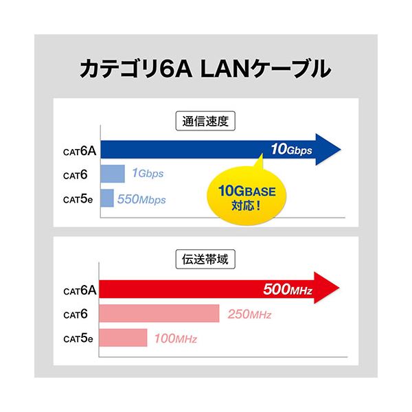 ●エンハンスドカテゴリ5の5.0倍、カテゴリ6の2.0倍の伝送帯域500MHzを実現!余裕の伝送帯域で、伝送エラーを防ぐ高性能カテゴリ6A LANケーブルです。