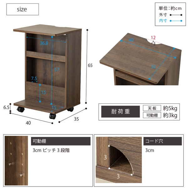 可動棚は3cmピッチで高さ3段階に調節でき、取り外して使う事もできます。