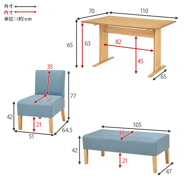 【商品サイズ(外寸)】テーブル:(約)幅110×奥行70×高さ65cm、チェア(1P):(約)幅51×奥行64.5×高さ77×座面高42cm、ベンチ:(約)幅105×奥行47×高さ42×座面高42cm