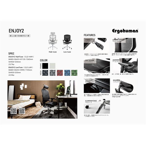 エルゴヒューマンの基本機能を搭載し、ゆるやかな曲線を基調としたすっきりとしたシャープなデザインが魅力のENJOYチェア!着座した時に背中全体をランバーサポート一体型のバックレストが支えてくれる、デスクワークをする全てのかたにおすすめのチェアです。