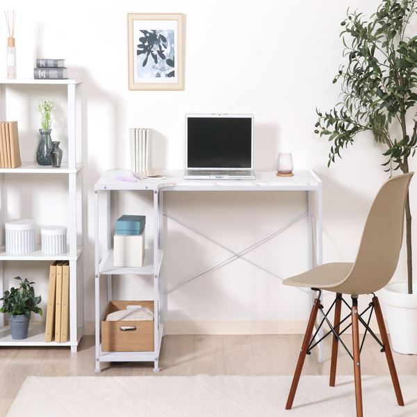 収納ラックは天板の左右どちらでも設置できるので、お部屋に合わせてご使用いただけます。