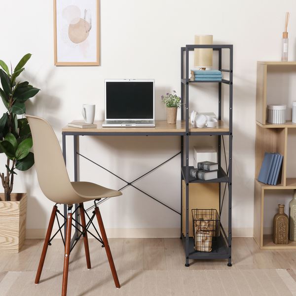 パソコンデスク ワークデスク 約幅1100mm ナチュラル 高さ調節可 左右組み換え ラック付き デスク 組立品 リビング【代引不可】