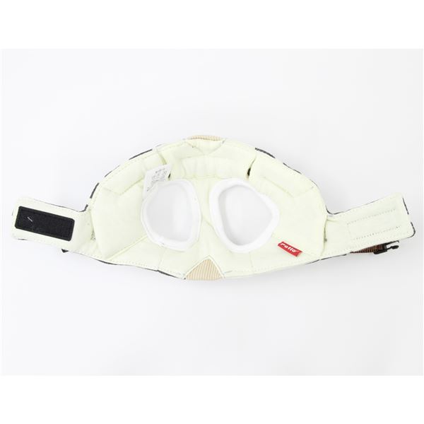 前あしをあし穴に入れてください。両端の面ファスナーとバックルを持ち上げ胴回りに合せて留めます。