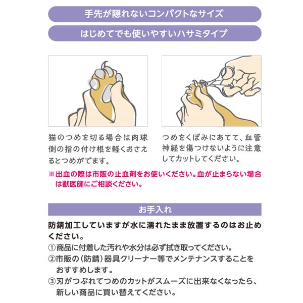 ・刃先のくぼみが小さなつめをしっかりホールドできる猫ちゃん用のミニつめ切りです。