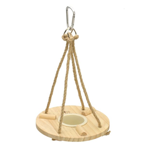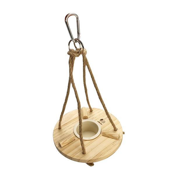 放鳥タイムの休憩場所。お部屋の中にゆらゆら揺れる止まり木を。取り外しが出来る中央のカップにとっておきのおやつを入れて・・・。うきわのような丸い形。