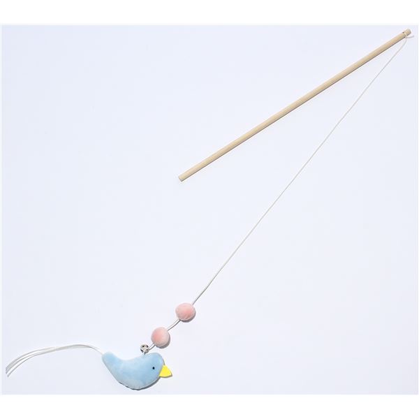 淡い色の鳥型おもちゃがゴム紐で繋った猫じゃらしです。持ち手部分(ロッド)は木でできており、ナチュラルな雰囲気のおもちゃになっています。頭部の近くには鈴と布ボールがそれぞれ一つ付いていて、動きでも音でも猫ちゃんを引きつけることができます。