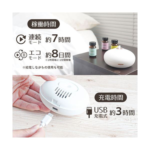連続モードは7時間の連続稼働、エコモードは1時間毎に1分間稼働し約8日間使用できます。