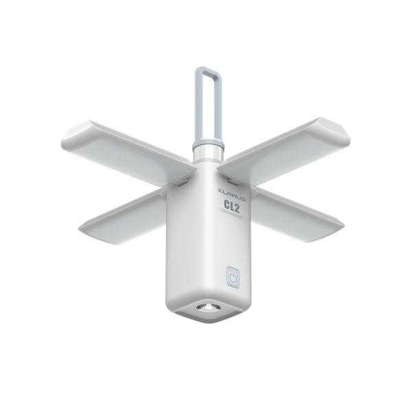 KLARUS キャンピングライトCL2 は、テント内に吊り下げてもテーブルに置いても使える、画期的なLEDライトです。4枚のLEDパネルは、色を暖色/白色に切替える他、赤色の点滅もできます。また、個々で独立していて、照射角度も0〜90°で自由に変更できます。底部のLEDは通常のライト使用の他に、スイッチ操作で、SOSの点滅もできます。更に、携帯電話に充電もできます。充電残量がわかる、バッテリインジケータ―付です。