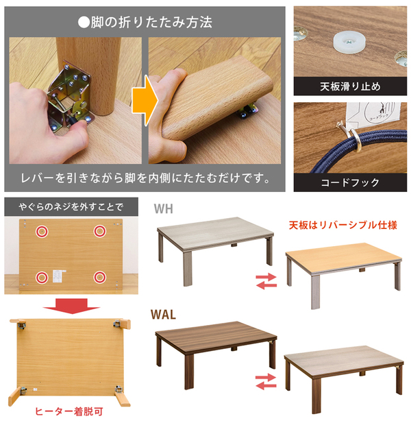 こちらは「折脚フラットヒーターコタツ 長方形 約幅105cm WAL(ウォールナット)」の商品ページです。商品画像や商品情報には、色違いやサイズ違いの商品が載っている場合がございます。ご注文前に色・サイズ・セット内容のご確認をお願いいたします。