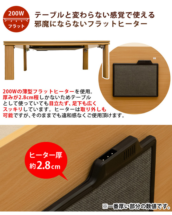 こたつとして使わない時もヒーターのでっぱりが無いため、テーブルとして使用しても違和感もありません