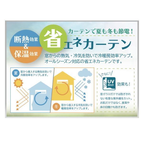 UVカット70%以上は光を取り入れつつ気になる紫外線をカットできます。お肌や家具、フローリングを日焼けから守ってくれます。ミラー加工の効果で光の反射によって日中外から室内が見えにくく、プライバシーを確保できます。外からの視線が気になる方におすすめです!断熱効果率25%以上、保温効果率20%以上で省エネ効果があります。アジャスターフック(Aフック)が付属されております。洗濯機での洗濯可能なのでお手入れも簡単です!