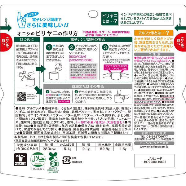 ■原材料名:うるち米(国産)、味付乾燥具材(乾燥人参、乾燥いんげん、味付玉ねぎ)、調味粉末(食塩、乾燥パクチー、香辛料、トマトパウダー、脱脂粉乳、オニオンエキスパウダー、バター風味パウダー、ベース調味料、ぶどう糖)/調味料(アミノ酸等)、香辛料抽出物、微粒酸化ケイ素、パプリカ色素、トレハロース、酸味料、酸化防止剤(ビタミンE)、香料、(一部に小麦・乳成分・大豆を含む)