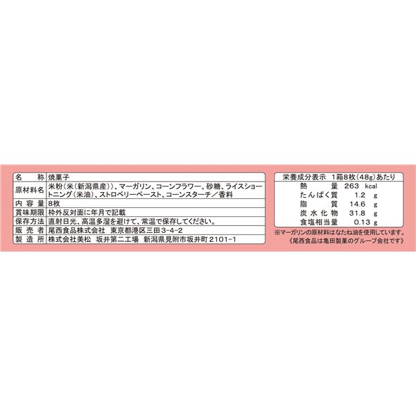 ■原材料名:米粉(米(新潟県産))、マーガリン、コーンフラワー、砂糖、ライスショートニング(米油)、ストロベリーペースト、コーンスターチ/香料