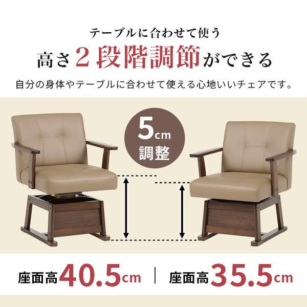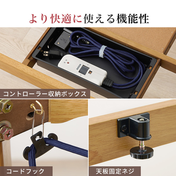 【仕様】こたつ:■組立式■コード収納ボックス付■天板固定ネジ付■3段階継脚(高さ6段階調節可)、チェア:■組立式■座面高5cm組替可能(スペーサー)■360°回転式