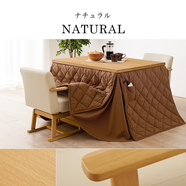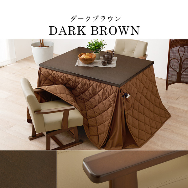 【材質】こたつ:<天板>天然木化粧繊維板<脚部>ラバーウッド<表面加工>UV塗装、ヒーター:MHU-601E(D) 600Wハロゲンヒーター(手元コントローラー付)、ふとん:<表地>ポリエステル(ピーチスキン)<中綿>ポリエステル(東レ マッシュロン使用)<裏地・スリットコーナー>ポリエステル(ピーチスキン)、チェア:<木部>ラバーウッド<張地>合成皮革