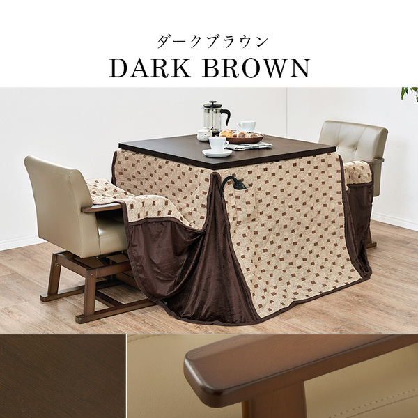 【材質】こたつ:<天板>天然木化粧繊維板<脚部>ラバーウッド<表面加工>UV塗装、ヒーター:MHU-601E(D) 600Wハロゲンヒーター(手元コントローラー付)、ふとん:<表地>ポリエステル(シェニール織)<中綿>ポリエステル<裏地・スリットコーナー>ポリエステル、チェア:<木部>ラバーウッド<張地>合成皮革