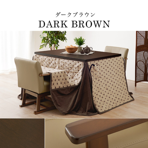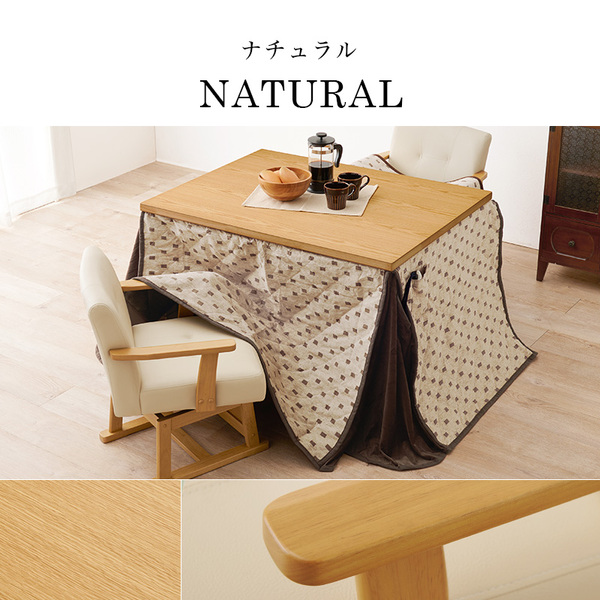 【材質】こたつ:<天板>天然木化粧繊維板<脚部>ラバーウッド<表面加工>UV塗装、ヒーター:MHU-601E(D) 600Wハロゲンヒーター(手元コントローラー付)、ふとん:<表地>ポリエステル(シェニール織)<中綿>ポリエステル<裏地・スリットコーナー>ポリエステル、チェア:<木部>ラバーウッド<張地>合成皮革