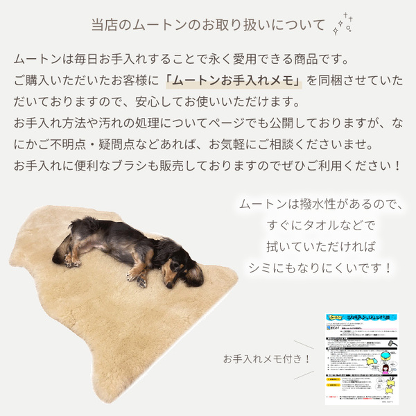 ムートンは吸湿性の高さとともに、撥水性の高い素材で、これは毛の表面は水を弾くのに、毛の内部は湿気を吸い取る性質から実現できるものです。撥水性が高く、一般的な化学繊維に比べムートンは汚れにくい素材と言えます。