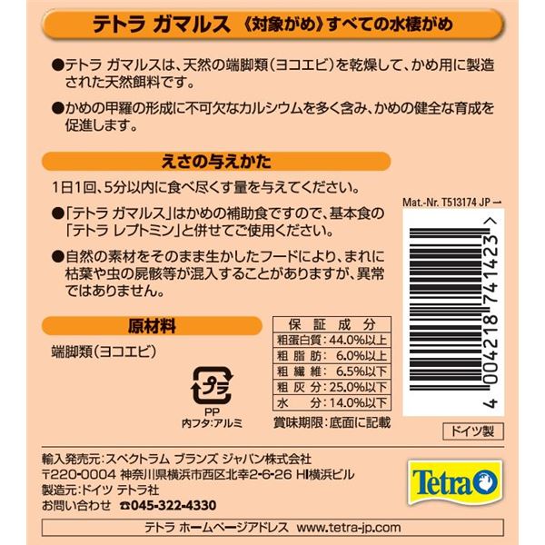 ・「テトラ ガマルス」はかめの補助食ですので、基本食の「テトラ レプトミン」と併せてご使用ください。