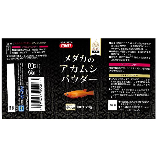 高嗜好性・高蛋白で成長期・繁殖期の栄養補給に適したエサです。パウダー状のエサなので、稚魚から成魚までご利用いただけます。