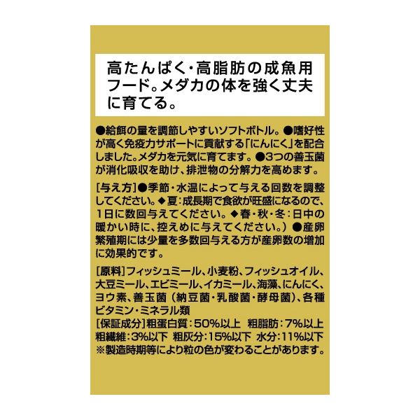 ・高たんぱく、高脂肪の成魚用フードです。メダカの体を強く丈夫に育てます。