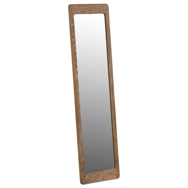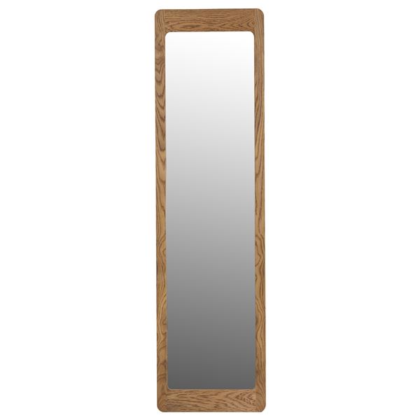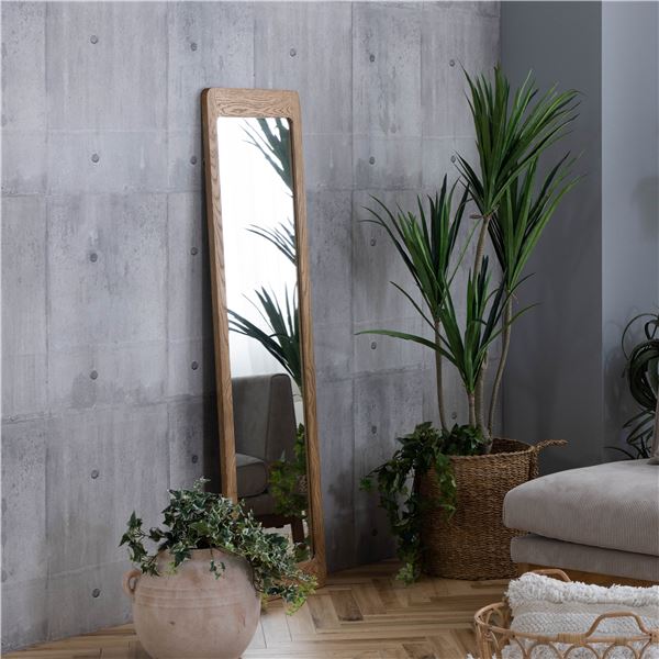 オーク無垢材を使用したいシンプルなデザインのスタンドミラー。あえてペタンとしたデザインで、ワンポイントとして上下と左右のフレームの幅を変えています。背面には転倒防止用の紐が付いています。※壁掛け用ではありません。